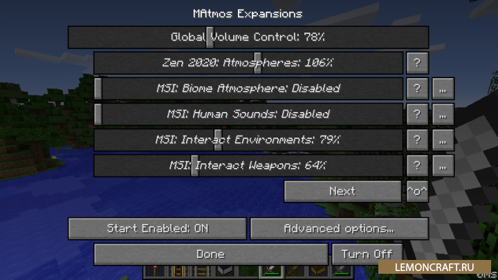 Мод на добавление звуков в игре MAtmos немного оживит игру майнкрафт новыми звуками, ведь стандартные звуки в игре уже всем порядком надоели. В игре появятся такие типы звуков, как треньканья сверчка ночью около травы, шум волн на берегу, свист ветра на высоте и другие. Появляени новых звуков будет полностью зависеть от условий игры, например ветер будет свистеть только на большой высоте. Если вы окажитесь на высокой горе и окружите себя блоками, свист ветра прекратится.
